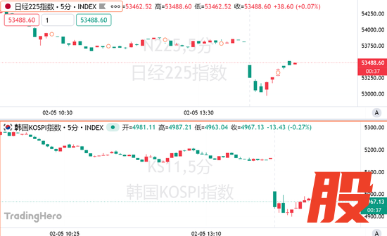 在美股科技股遭遇重挫打击风险偏好之后,全球股市的跌势蔓延至亚洲交易时段。盘中,日经225指数回落至53000点下方,日内跌1.57%。韩国KOSPI指数开盘下跌3.35%,韩国KOSPI 200指数期货一度下跌5%,程序化交易暂停5分钟。截至发稿, 跌势有所缓和。