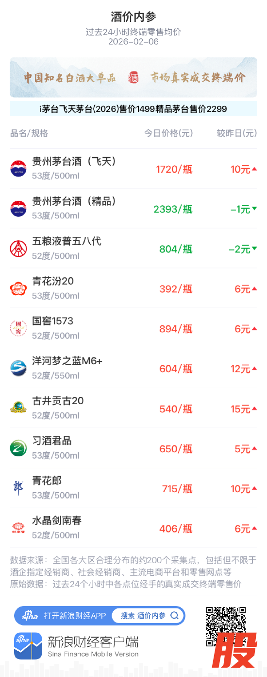 新浪财经“酒价内参”过去24小时收集的数据显示,中国白酒市场十大单品的终端零售均价在2月6日大幅攀升。如果十大单品各取一瓶整体打包售卖,今日总售价为9118元,较昨日上涨67元,创2026年以来新高。在此前短暂横盘后,价格中枢再度抬升,整体水平刷新阶段高点。